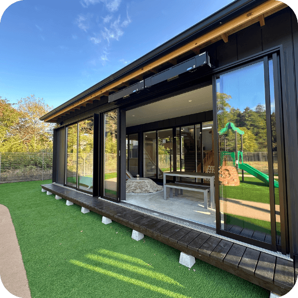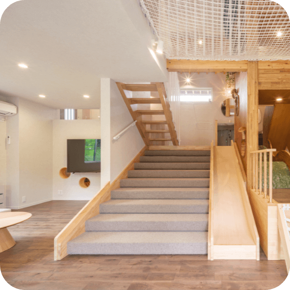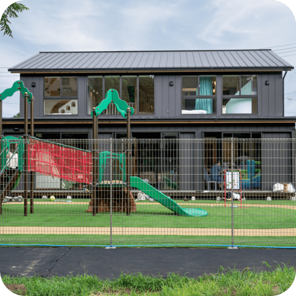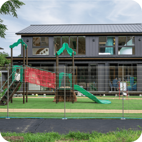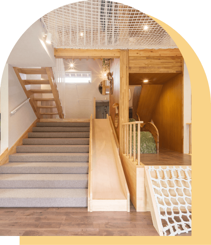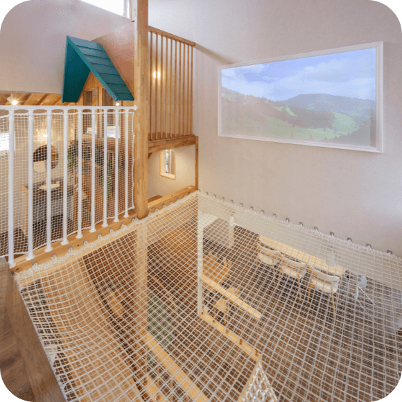 180cmフェンスや段差を抑えた設計、高い手すり、角のない家具など、子どもたちの「やってみたい」を安心して見守れる空間です。