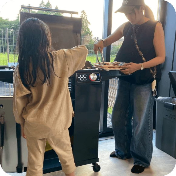 電気コンロだから煙や火の心配もなし。キッズテントでグランピング気分を味わいながら食事も楽しめます。