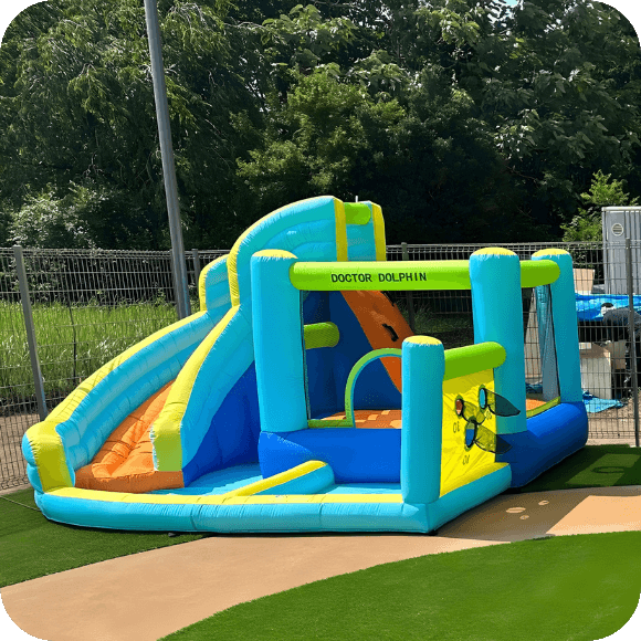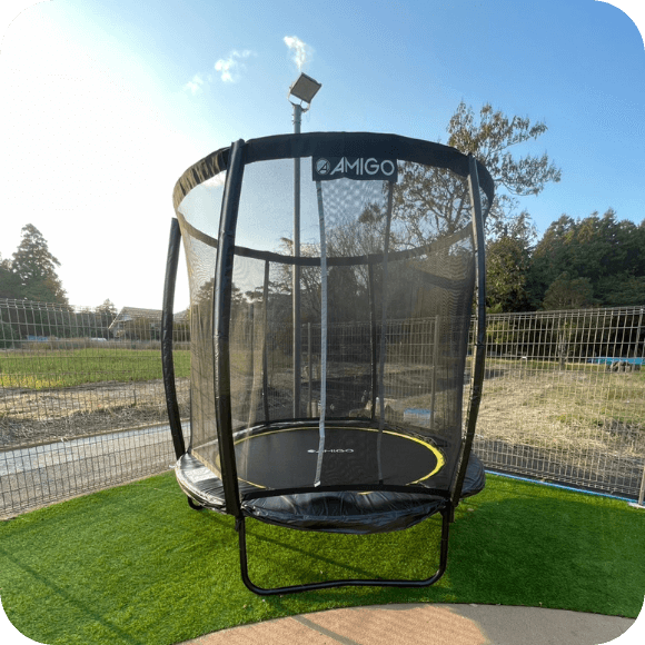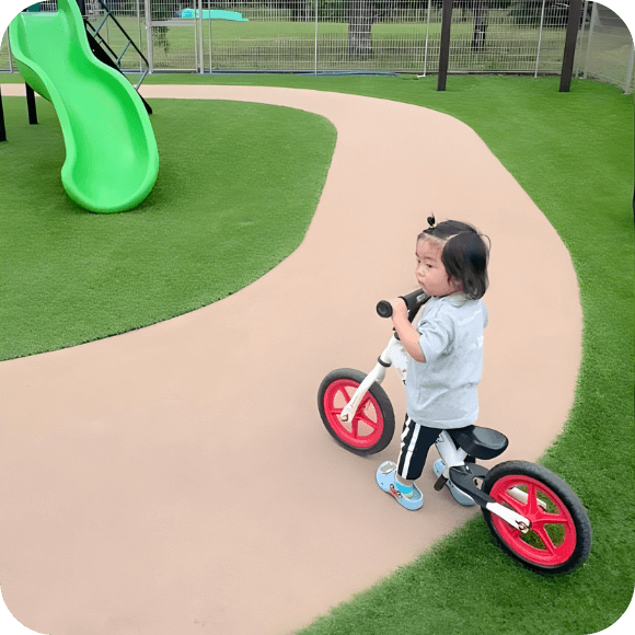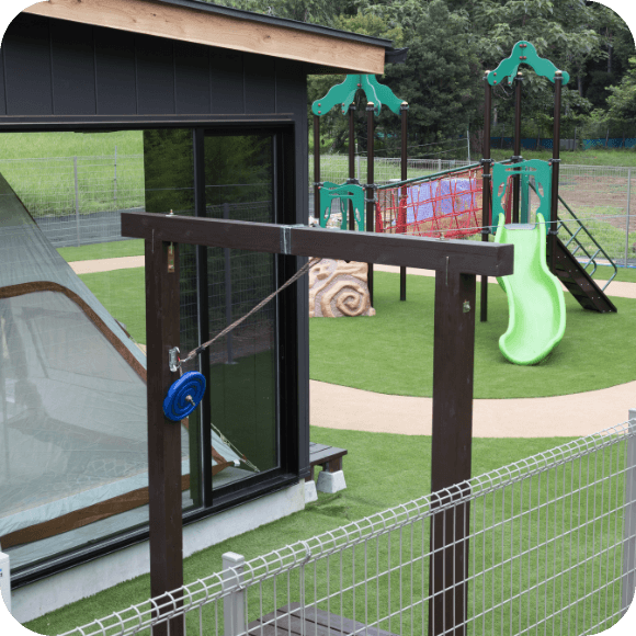 180cmのフェンスで安全性を守りながら、自転車練習やボール遊び、ジップラインまで自由に楽しめます。