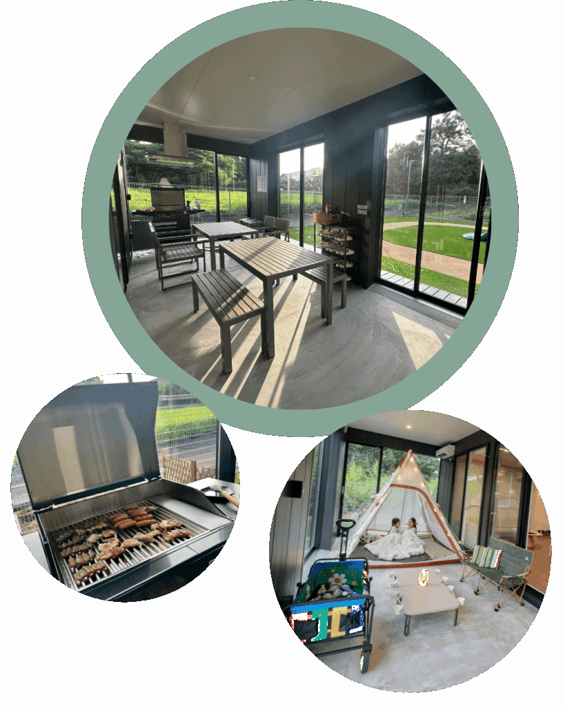 - エアコン2台で真夏も真冬も快適にBBQが楽しめる